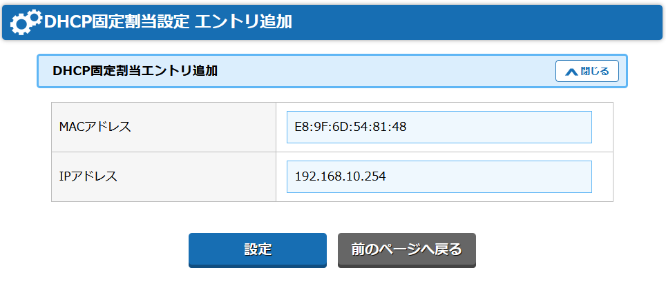 設定が完了すると、DHCP固定割当設定画面に、先ほど追加したエントリが一覧として表示されます。
