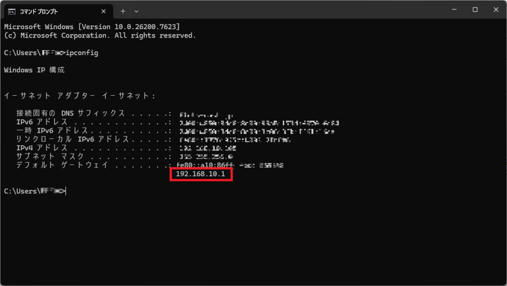 ルーターへアクセスするためのIPアドレスは、Windowsのコマンドプロンプトから確認できます。
