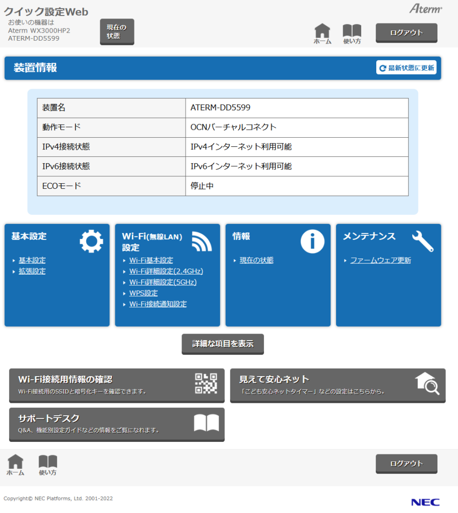 ログインすると、ルーターの設定画面が表示されます。