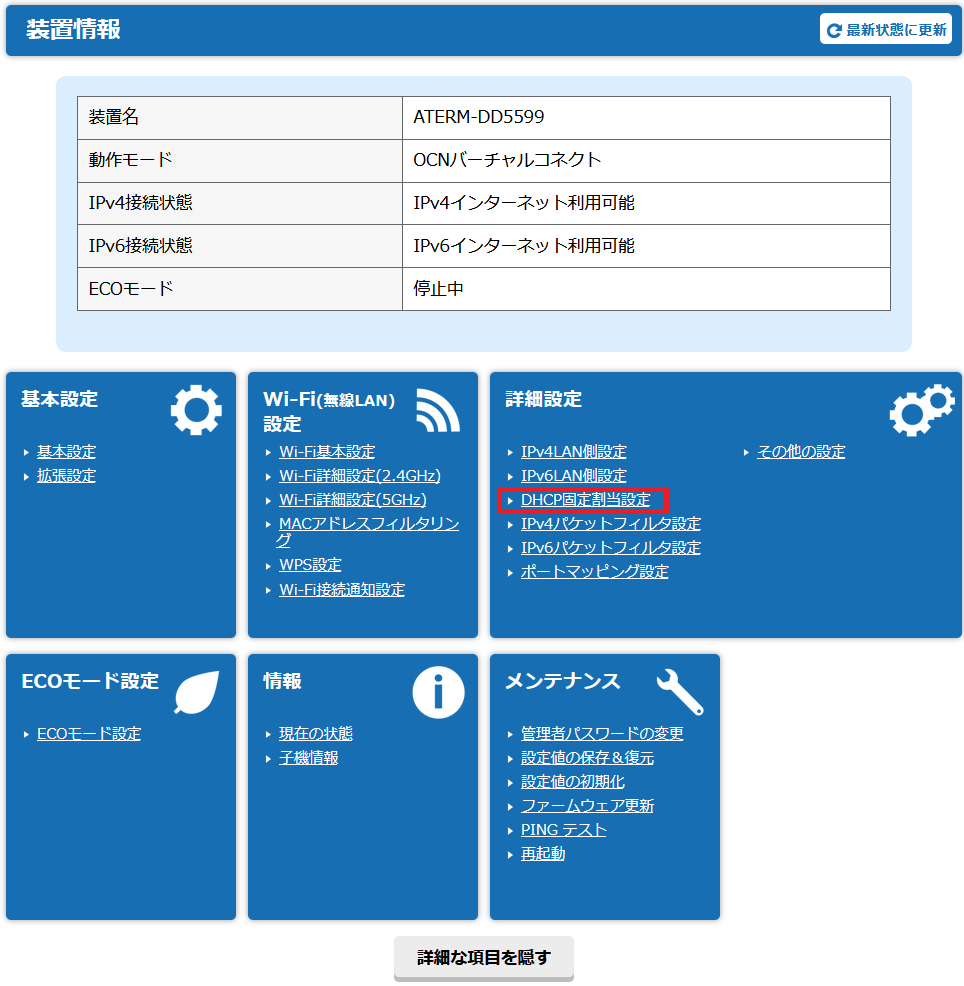 「詳細設定」→「DHCP固定割当設定」