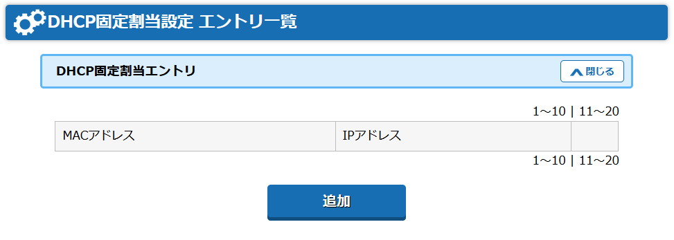DHCP固定割当設定画面が表示されたら、「追加」を押して新しい設定を登録します。